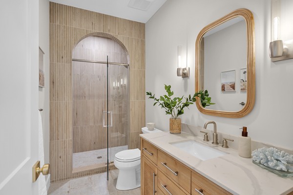 When these homeowners turned to Amiano & Son to remodel their entire home it was the perfect job for the company's lead designer Sophia Amiano. While still keeping the home's original bones intact, Amiano was able to reimagine each space by including several key features. Some of these updates included larger windows for better ocean views and shiplap on the ceiling blended with raw wood beams to add luxury while maintaining a coastal vibe. To further add unique character to the home, she also added focal points throughout like a wood tiled arch in the bathroom.