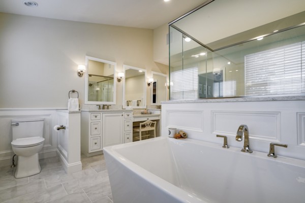 Besides adding the third bathroom and the walk-in closet, complete with a three-way mirror, the project involved the master bathroom, the hallway bathroom, and the master bedroom. Gehman's team installed hardwood floors throughout the upstairs, updated the tile flooring in the existing bathrooms, and replaced a nine-foot-wide patio door off the master bedroom, which necessitated the use of a crane.