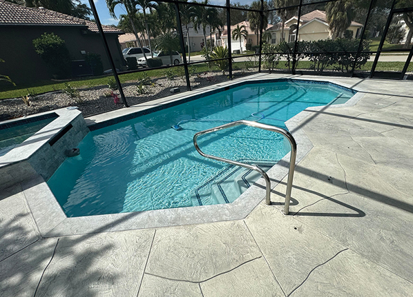Resurfacing a pool deck also comes with significant cost savings. "Pool decks, as they age, can have movement, creating cracks and unlevel pads. The heavy equipment required to bring new concrete into a backyard is labor intensive, which makes the cost higher," she says. "On top of that, your landscaping and grass are damaged, your fence has to be taken down – our process is no mess. We use small pieces of hand equipment that can be carried in and out, causing no impact to your landscaping."