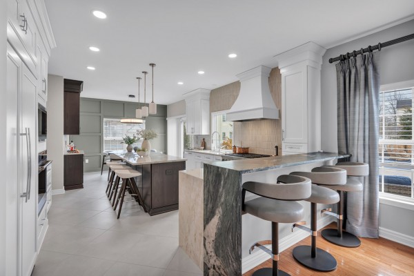 This beautifully functional kitchen features a custom two-tier, double waterfall countertop that adds chic dimension and character while creating an inviting extra dining area. The pairing of one matte surface with one glossy finish introduces a striking contrast in texture, elevating the overall design. A luxurious built-in bar beside the dining table enhances both style and functionality, making it ideal for hosting and entertaining. With its absolutely stunning finishes and thoughtful layout, this kitchen seamlessly blends elegance and practicality into a space made for gathering.