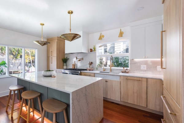 This redesign replaced the original single-wall layout and small eat-in nook with a center island featuring a marble waterfall edge and sage green shiplap base, creating a natural gathering spot for family and guests. New light, white oak slab-front perimeter cabinets paired with brushed brass hardware, statement pendants and swing-arm sconces bring warmth and sophistication throughout. A full-height Calacatta marble backsplash behind the range, under-cabinet lighting and a gold bridge-style faucet complete the elevated look.