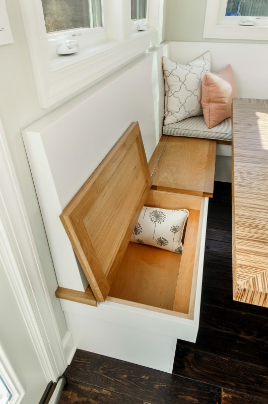 Once the structural engineering was addressed, Harth Builders set to work relocating the powder and laundry rooms to a more central location and creating a dining nook adjacent to the sunroom. Sunroom windows were replaced and the space was reinsulated. In the kitchen, Harth Builders created a new island with an offset angled, raised seating area. Cabinets are frameless European-style made of oak and feature book-matched grain slab-panel doors and drawers. Five-inch hardwood flooring in a warm brown stain with scraped surface unites the spaces and lends a rustic tone. Among the homeowners’ favorite features are the blue, elongated hexagonal, crackle-glass tile backsplash and the Azurite granite countertop on the island.