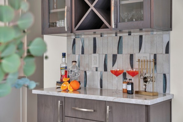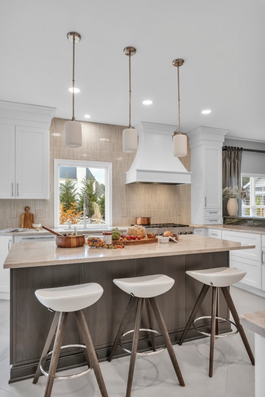 As a lead designer for Amiano & Son, Sophia Amiano is well-versed in how to create a homeowner's dream kitchen. Here she worked to maximize the current space by creating an open-floor layout to breathe new life into the space, blending the husband's desire for a Scandinavian look with his wife's more traditional leanings. Amiano created a beautiful two-tier, two-toned waterfall effect with the kitchen countertop, utilizing different textures of matte and glossy finishes to create a unique feel of luxury.