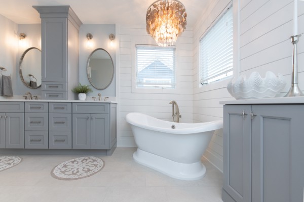 The sleek gray tones and mixed textures in this Jersey Shore bath create a serene, spa-like oasis. Added shiplap and seashell light fixtures bring in coastal charm while maintaining a luxurious touch, completely recreating the space from its original design.