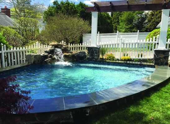 In addition to making the pool an outdoor living space, some of the latest trends pool owners are having installed in their pools are water features, custom slides, shallow lagoon areas, grottos, swim-up bars, and custom pool plaster finishes such as quartz, pebble and glass, says DiCesare.